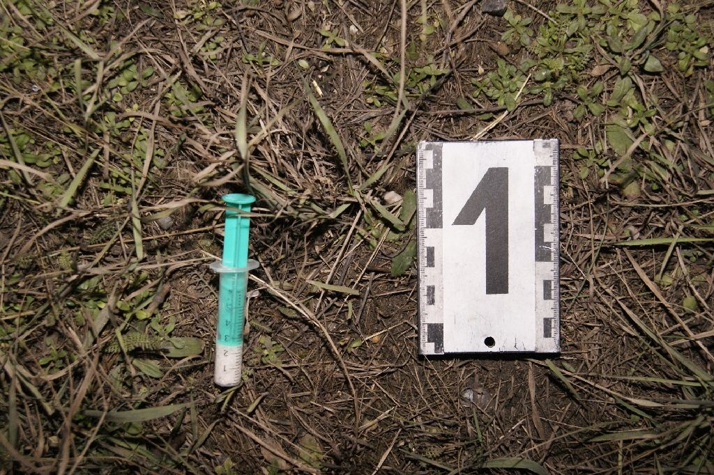 A bűnügyi helyszínelők az eldobott bűnjel után kutatva, a 83-as számú főút melletti árokban egy kábítószergyanús fehér porral teli műanyag zacskót és egy fecskendőt foglaltak le.