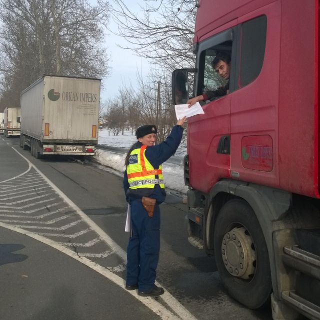 Három nyelvű szórólappal tájékoztatja a határ előtt várakozókat a rendőrség.