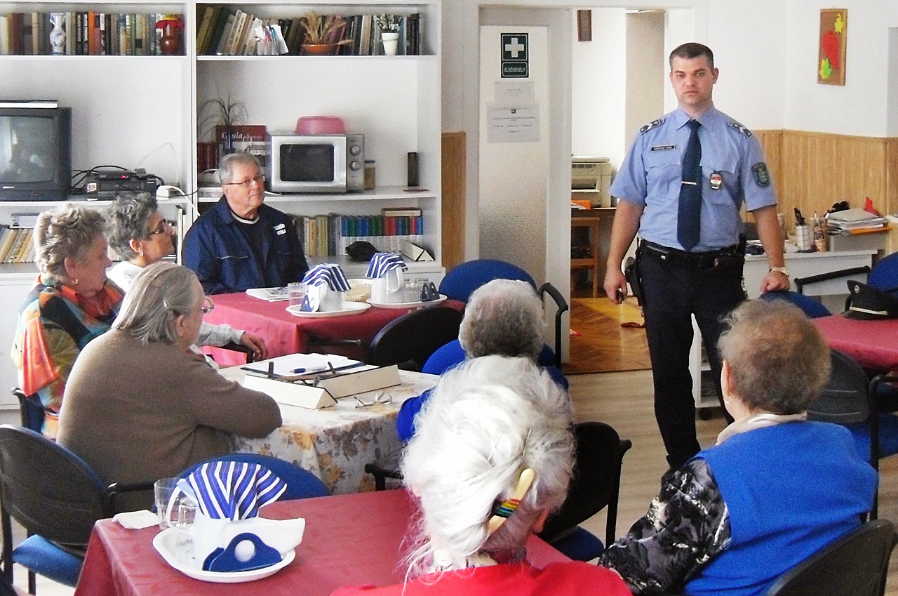 Gyulán, a Kálvin utcai 5. számú idősek klubjába látogatott el a rendőrség két munkatársa 2014. október 1-jén. A Békés Megyei Rendőr-főkapitányság bűnmegelőzési osztályának kiemelt főelőadója, Bátkai Miklós r. alezredes és Szentléleki Tamás r. zászlós, a Gyulai Rendőrkapitányság körzeti megbízottja az Idősek Világnapja alkalmából köszöntötték a megjelenteket. Ezt követően a bűncselekmények megelőzése érdekében adtak hasznos tanácsokat az időseknek. Hangsúlyozták, hogy váratlanul érkező idegeneket ne engedjenek be otthonaikba. A szolgáltatók előre közlik, egyeztetik azokat az időpontokat, amikor valamilyen munkavégzés, mérőóra leolvasás céljából megjelennek. Ilyen ürüggyel érkező, gyors döntést sürgető idegeneket ne engedjenek be. Értékeiket, pénzüket lehetőleg ne tartsák otthon. A rossz szándékkal házalók, ha beengedik őket, az esetek többségében megtalálják a hosszú évek alatt megtakarított, szükség esetére félre tett összeget. Legyenek óvatosak azokkal a kereskedőkkel, akik vonzónak tűnő ajánlatokkal csengetnek be! Először mérlegeljék, hogy a kínált szolgáltatásra, termékre szükségük van-e. Amennyiben igen, beszéljék meg az üzletkötővel, hogy egy későbbi időpontban jöjjön vissza, amikor fiatalabb családtagjaik is ott lesznek és a segítségükkel döntést tud hozni. Ha vásárolnak valamit, ne vegyék elő idegenek előtt az összes megtakarításukat. A szállító érkezése előtt (pl. tüzelő vásárlása esetén) készítsék elő azt az összeget, amire szükségük lesz. Az előadók kiemelték: támogatást, visszatérítést az önkormányzatok, a szolgáltatók nem visznek házhoz. Ne engedjék be azokat az ismeretleneket, akik azt állítják: valamilyen jogcímen pénzt hoztak. Végül arra kérték az időseket, hogy ha megkárosítják őket, azonnal értesítsék a rendőrséget a díjmentesen hívható 107-es vagy a 112-es segélyhívó számok bármelyikén. A Gyulai Rendőrkapitányság munkatársai a bejelentést követően haladéktalanul megteszik a szükséges intézkedéseket.