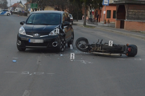 Vésztőn, a Kossuth utcában 14 óra 30 perckor egy személyautó vezetője áttért a menetiránya szerinti bal oldali forgalmi sávba, ahol összeütközött a neki szemből érkező motorossal. A motorkerékpárt vezető férfi elesett és megsérült, sérülése nem súlyos.