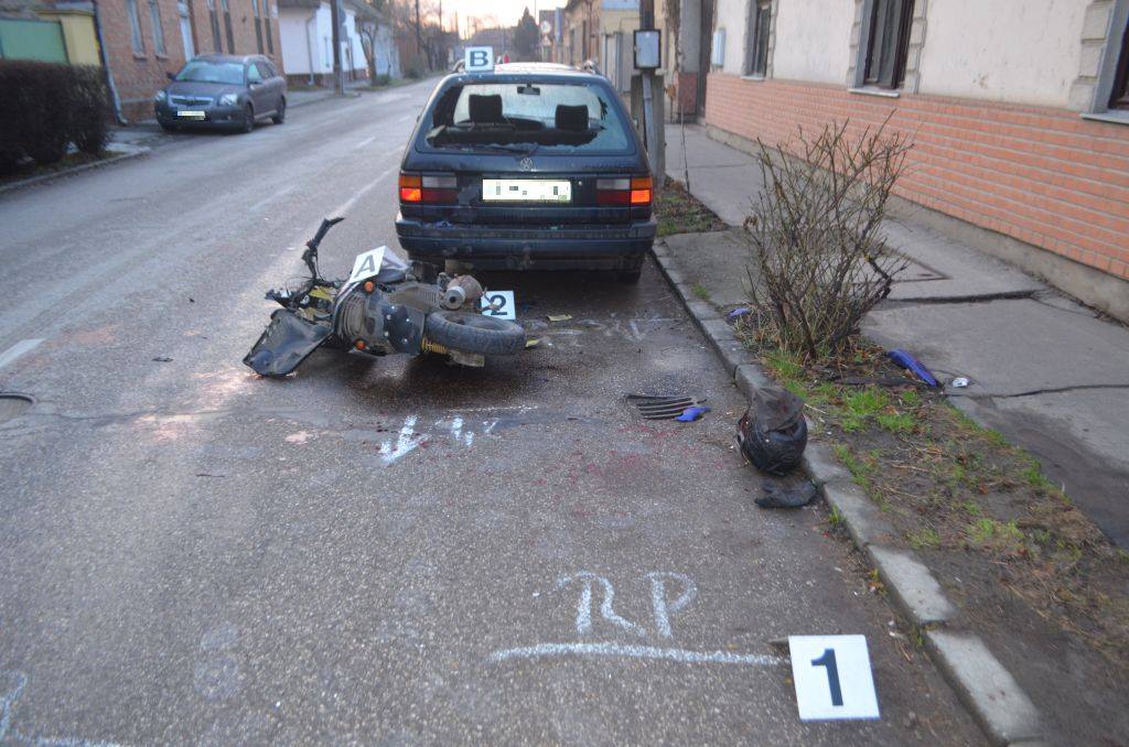 Egy segédmotort vezető férfi 2017. március 6-án 5 óra 25 perckor Hódmezővásárhely belterületén kanyarodása során kisodródott, majd egy szabályosan parkoló gépkocsinak ütközött. A baleset okozója súlyosan sérült.