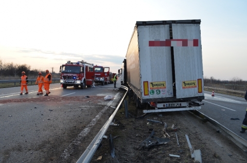 Egy tehergépkocsi a szalagkorlátnak ütközött 2017. március 13-án 16 óra körül az M43-as autópálya 11-es kilométerszelvényében. A balesetben senki nem sérült meg.
