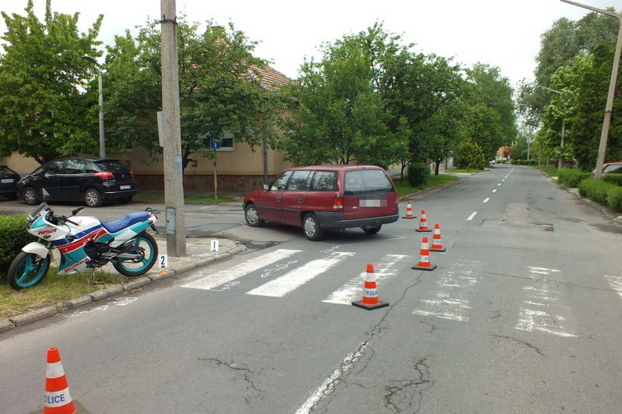 Egy nő közlekedett személygépkocsival 2017. május 9-én 13 óra 30 perc körül Jászberény belterületén. Egy kereszteződéshez érve balra kívánt kanyarodni, azonban nem észlelte a vele szemből érkező segédmotoros kerékpárost, akivel összeütközött. Az elsődleges orvosi vélemény alapján a motoros könnyű sérülést szenvedett.