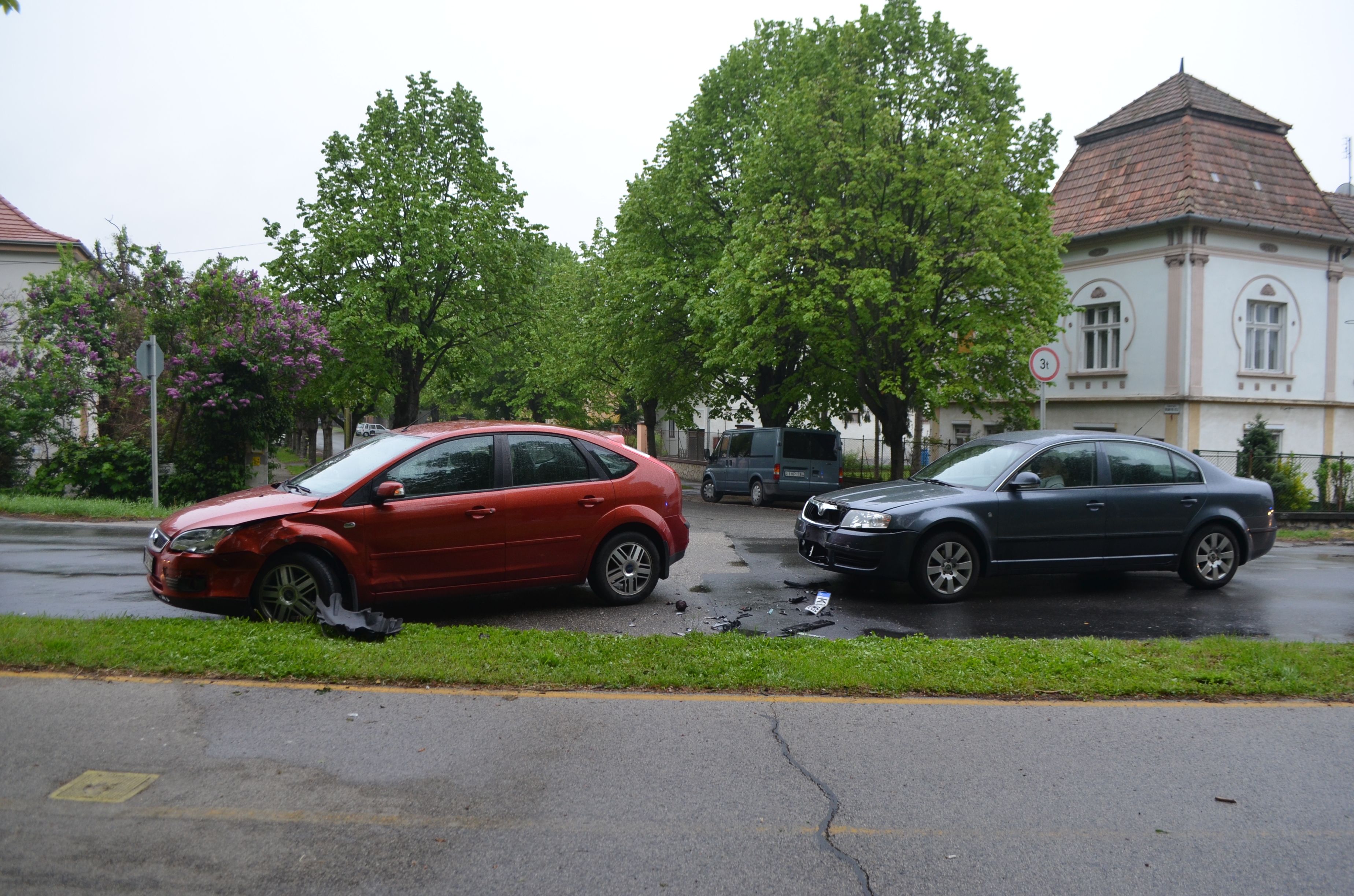 Pápán történt anyagi káros baleset 2017. április 27-én. Az elsőbbség meg nem adása miatt ütközött össze két személygépkocsi.