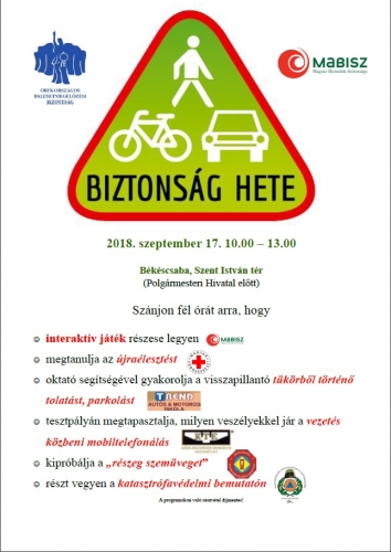 Az Országos Baleset-megelőzési Bizottság és a Magyar Biztosítók Szövetsége 2018. szeptember 17-e és 23-a között „Biztonság hete” címmel rendez országos programot. Ennek keretében Békés megyében 2018. szeptember 17-én, hétfőn, Békéscsabán, a Szent István téren várja az érdeklődőket a Békés Megyei Baleset-megelőzési Bizottság. A 10 órakor kezdődő és 13 óráig tartó rendezvényen, több állomáson, különböző megközelítésben foglalkoznak a szakemberek a biztonság kérdésével. Az érdeklődők vetélkedőkön, interaktív játékokban vehetnek részt, hasznos ismereteket sajátíthatnak el és tanácsokat kaphatnak, így például a Magyar Vöröskereszt szakembereitől megtanulhatják az újraélesztést. A személygépkocsit vezetők oktató segítségével gyakorolhatják, hogyan tolassanak, parkoljanak a tükrök segítségével és tesztpályán tapasztalhatják meg, milyen veszélyekkel jár, ha vezetés közben mobiltelefont használnak. Ki lehet majd próbálni az úgynevezett részeg szemüveget, amelynek segítségével józanul is megtapasztalhatják, hogyan érzékeli környezetét, a körülötte lévő forgalmat egy ittas közlekedő. Bemutatót tart a katasztrófavédelem, a szervezet szakemberei a tűzesetek megelőzésével kapcsolatos információkkal is szolgálnak majd a rendezvényre ellátogatóknak. A szervezők a gyermekek számára is készülnek játékos feladatokkal, apró ajándékokkal. A programban résztvevő szervezetek minden érdeklődőt szeretettel várnak 2018. szeptember 17-én, Békéscsabán, a „Biztonság hete” elnevezésű rendezvény Békés megyei állomásán.