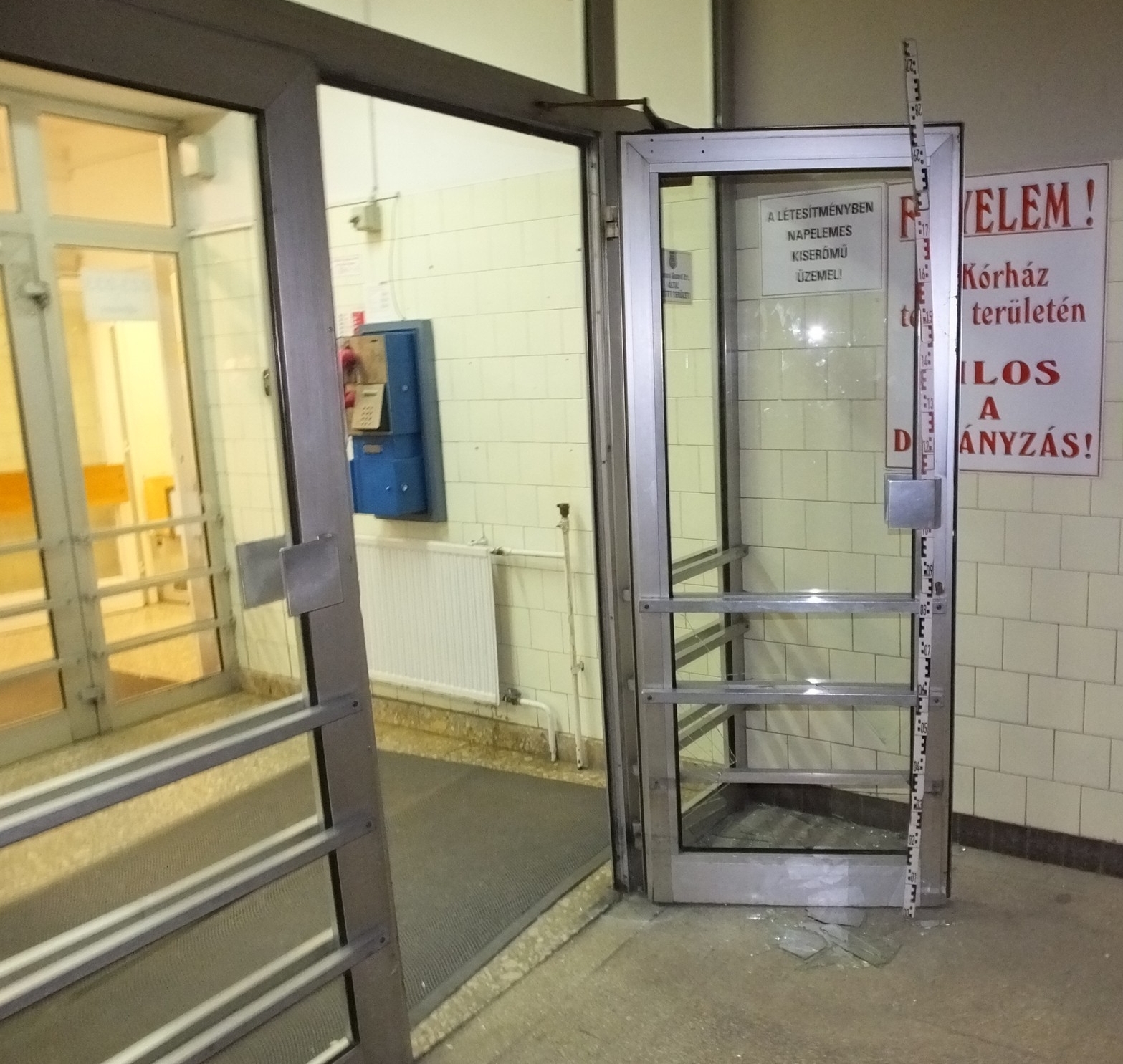 A nyomozás adatai szerint egy debreceni egészségügyi intézmény biztonsági őre tett bejelentést 2016. február 5-én a rendőrségre arról, hogy a kórház üvegajtaját betörte egy férfi, akit megpróbált a helyszínen visszatartani, de elszaladt. A bejelentést követően a rendőrök a kórházhoz mentek, ahol adatgyűjtést és tanúkutatást végeztek, amelynek alapján azonosították a bűncselekmény elkövetésével megalapozottan gyanúsítható B. Richárd helyi lakost. A nyomozók gyanúsítottként hallgatták ki a 21 éves férfit, aki beismerő vallomást tett. A debreceni férfi elmondta, hogy a kórház bejárati ajtajánál található nyilvános készüléken telefonálni akart, de az nem működött, ezért ideges lett és belerúgott az ajtóüvegbe, ami betört.