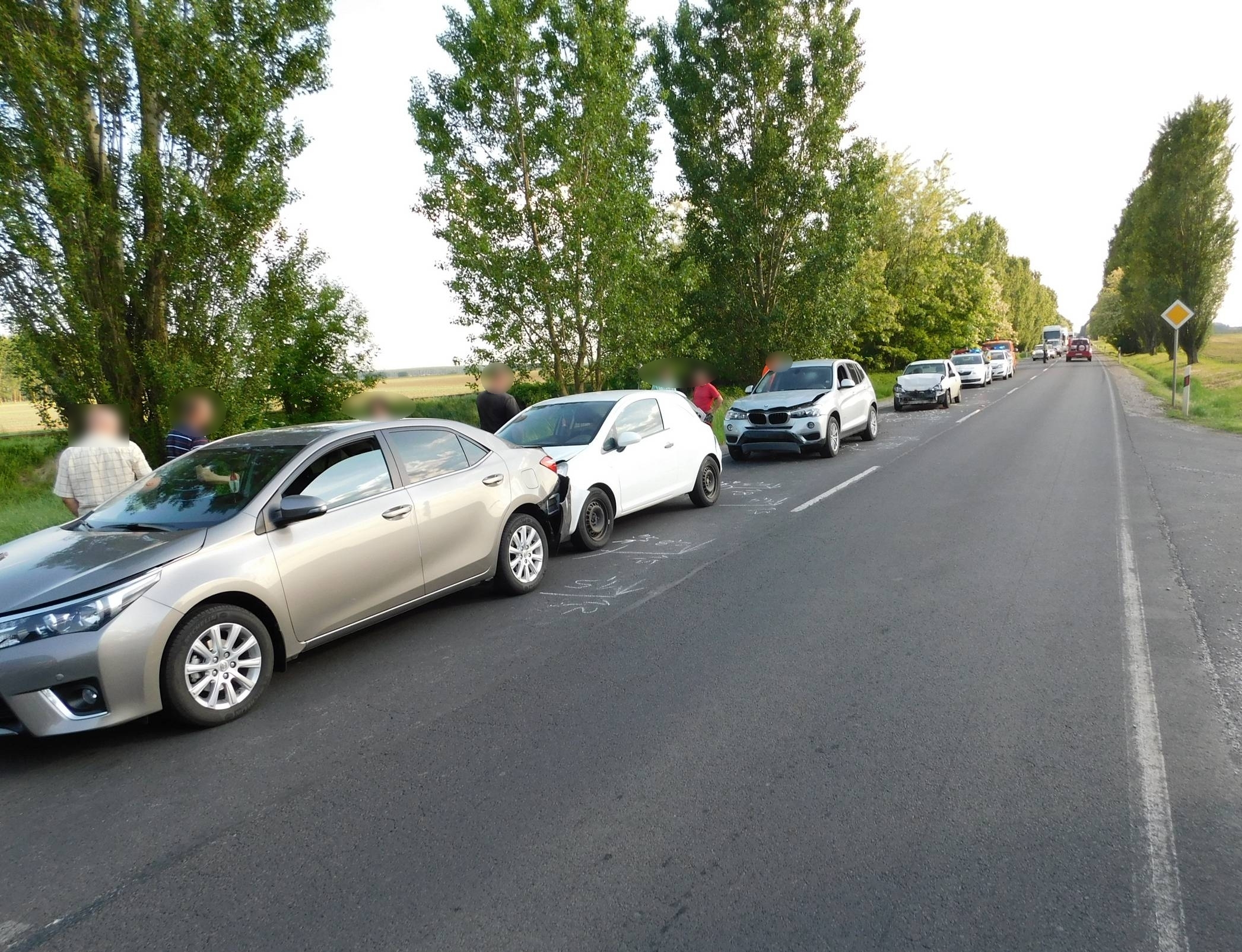 Egy nő 2017. május 18-án 15 óra 42 perckor az általa vezetett gépkocsival közlekedett a 47. számú főúton Derecske felől Sáránd irányába. A sofőr nem tartott megfelelő követési távolságot az előtte fékező, majd megálló személygépkocsi mögött, amelynek nekiütközött. A baleset következtében a személygépkocsi neki ütközött az előtte álló gépjárműnek, ami nekiment az előtte szintén álló gépkocsi hátsó részének. A baleset során a nő által vezetett gépjárműnek neki ütközött egy mögötte haladó gépkocsi is, amellyel összeütközött még egy gépjármű. A baleset következtében az elsődleges orvosi vélemény szerint a nő könnyű sérülést szenvedett. A baleset körülményeit a Berettyóújfalui Rendőrkapitányság vizsgálja.