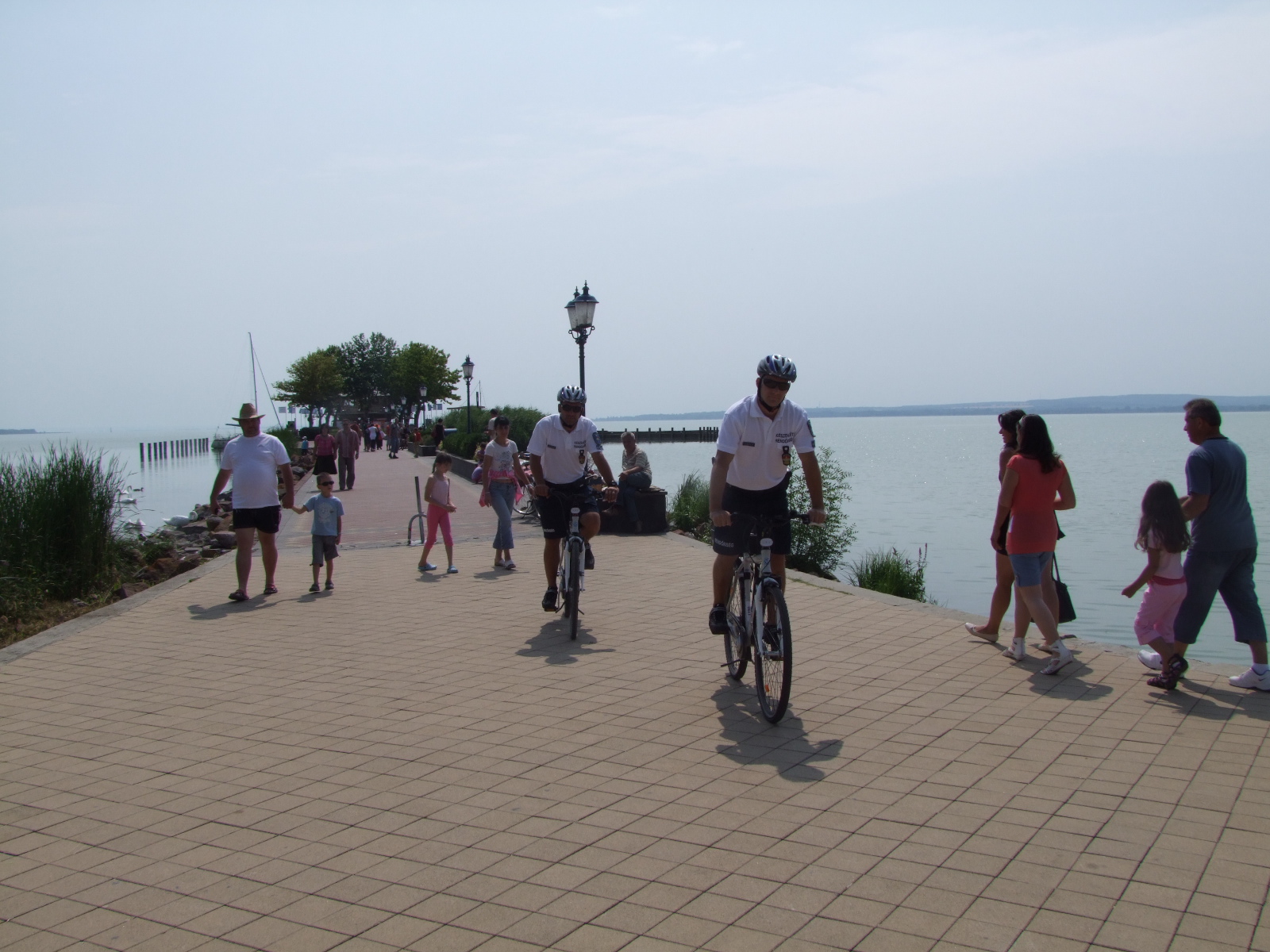 A Készenléti Rendőrség munkatársai gyalogosan és kerékpárral látnak el szolgálaton Zala Megyében, a Balaton parton.