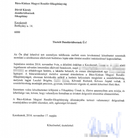 Az esettel kapcsoltban a sértett köszönetét fejezte ki Dávid Károly r. dandártábornok, megyei rendőrfőkapitánynak és a Bács-Kiskun Megyei Rendőr-főkapitányság munkatársainak Laczkó Brigitta r. alezredesnek, Kövesdi Richárd r. törzszászlósnak, illetve Kövecs Árpád r. zászlósnak.