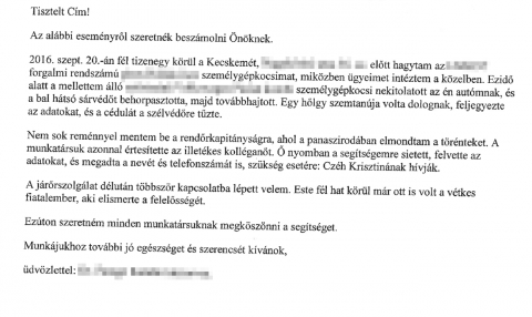 Bejelentés érkezett a rendőrségre arról, hogy 2016. szeptember 20-án 10 óra 30 perc körül Kecskemét belvárosában egy parkoló személygépkocsinak nekiment egy ismeretlen tettes, aki -adatai hátrahagyása nélkül- elhajtott a helyszínről.