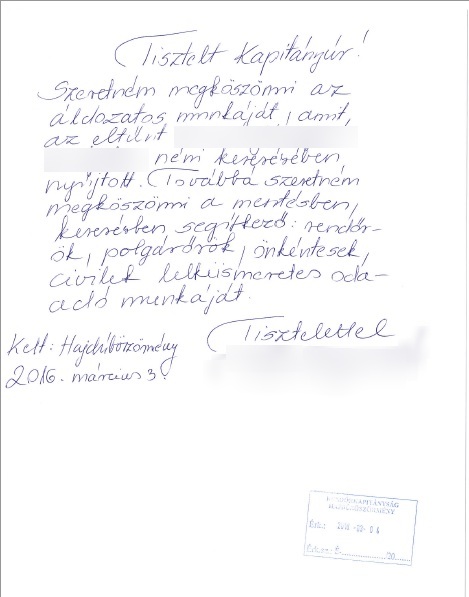 A 87 éves idős néni rokona és egyben gondozója köszönőlevelet küldött Hajdúböszörmény rendőrkapitányának.
