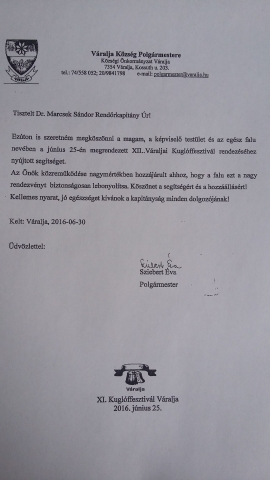 A váraljai polgármester köszönte meg a bonyhádi rendőrök által nyújtott segítséget a Kuglóffesztivál biztonságos lebonyolításában.
