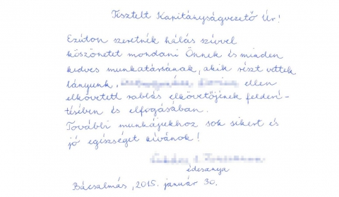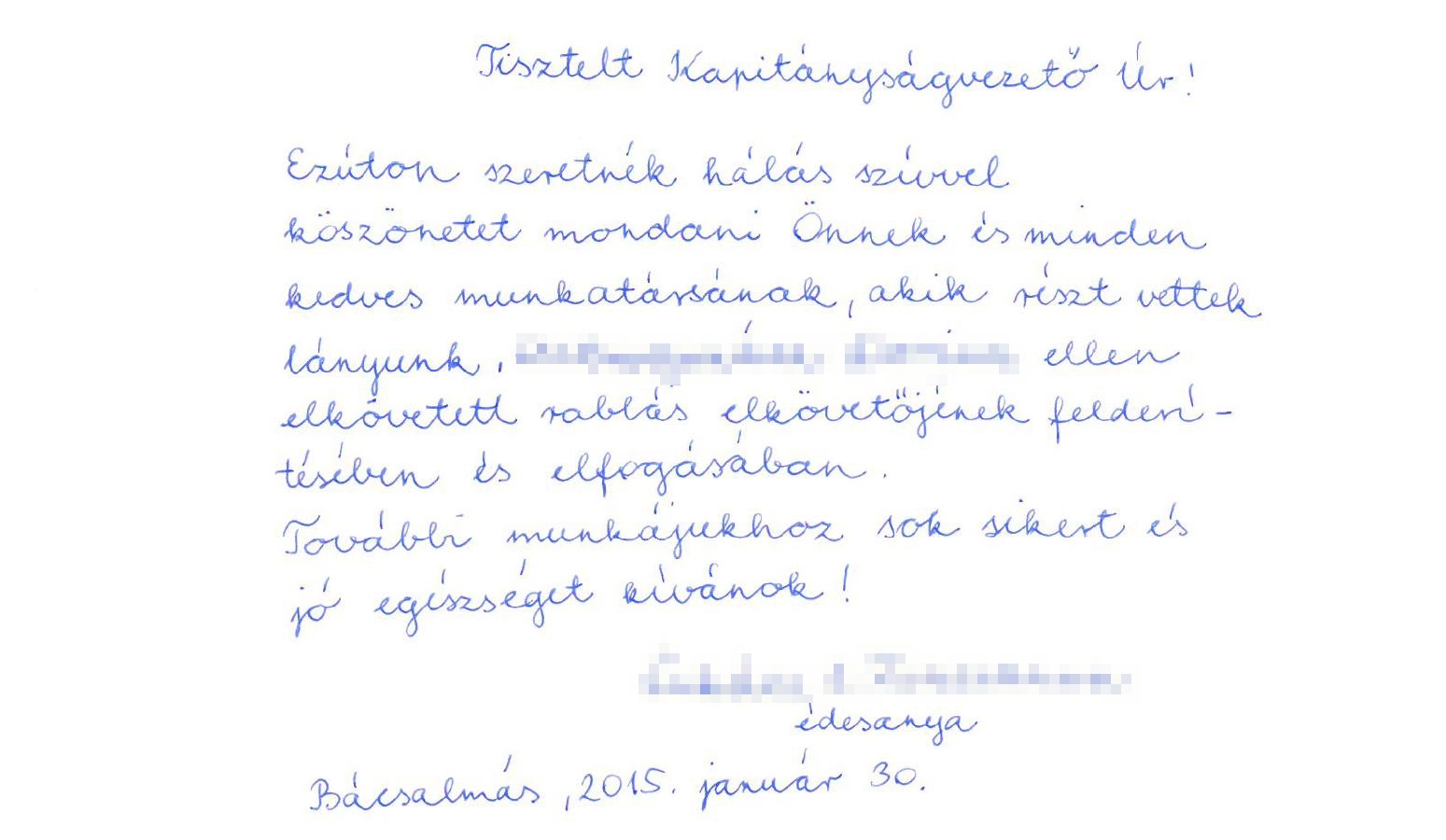 A 19 éves sértett édesanyja levélben köszönte meg András István r. alezredesnek, bajai rendőrkapitánynak, a lánya sérelmére elkövetett bűncselekmény felderítésében és az elkövető elfogásában végzett munkát.