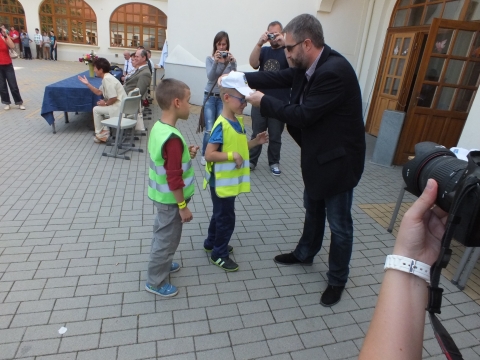 Unger Tamás, Pápa alpolgármestere az első osztályos diák számára fényvisszaverő elemekkel díszített baseball sapkákat adott át.