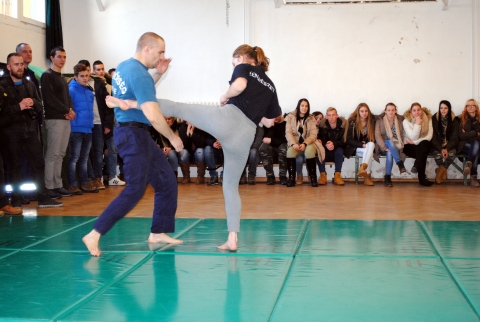A rendőrség tornatermében egy látványos intézkedéstaktikai bemutató várta őket, aminek külön érdekessége az volt, hogy a hivatásos rendőr kolléga mellett egy rendészeti fakultációs középiskolás is szerepelt.