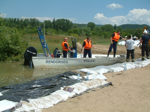 Pilismaróton a rendőrség biztosítja az árvízvédelmi munkák zavartalanságát.