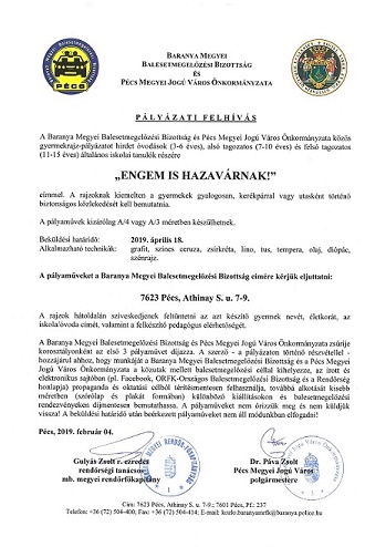 A Baranya Megyei Balesetmegelőzési Bizottság és Pécs Megyei Jogú Város Önkormányzata baleset-megelőzési céllal rajzpályázatot hirdet óvodás és általános iskoláskorú gyermekek részére „Engem is hazavárnak!” címmel.