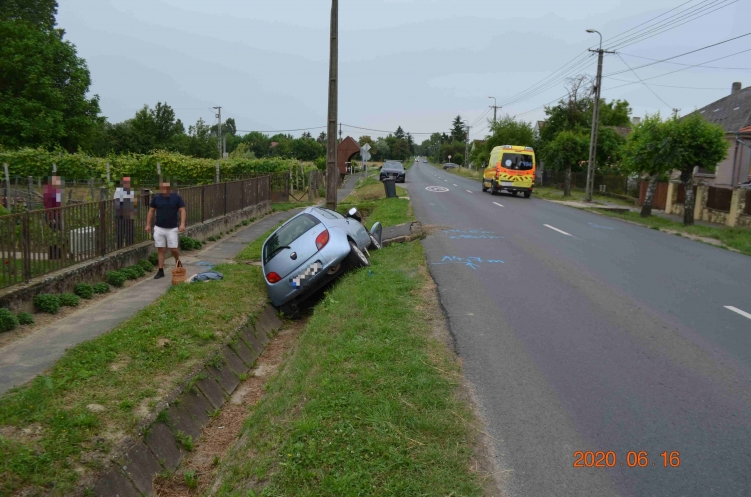Egy 64 éves szombathelyi nő közlekedett Ford személyautóval 2020. június 16-án 7 óra 2 perckor Hahóton, a Zrínyi Miklós utcában. Haladása során áttért a bal oldali forgalmi sávba, majd az útpadkán keresztül a vízelvezető árokba hajtva egy beton hídfejnek ütközött. A baleset következtében a sofőr könnyű sérüléseket szenvedett.