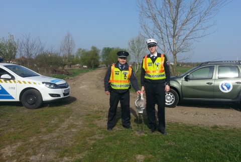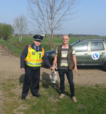 A polgári rendőrök átadták a szürke darut a Hortobágyi Madárkórház munkatársának.