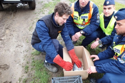 Kövér István a Hortobágyi Állatkórház önkéntese vette át a rendőröktől a madarat.