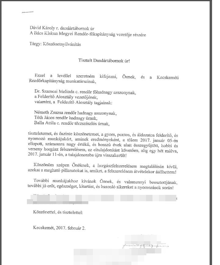 A horgászfelszerelést a kecskeméti nyomozók 2017. január 11-én 11 órakor visszaadták a sértettnek, aki levélben köszönte meg a gyors felderítést. A Bács-Kiskun Megyei Rendőr-főkapitányság vezetőjének címzett soraiból kiderül, hogy számára nagy értéket képvisel a felszerelés, valamint sok sikert, további jó erőt, egészséget, kitartást és sikeres munkát kívánt a rendőröknek.
