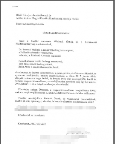 A sértett levélben köszönte meg a gyors felderítést a kecskeméti rendőröknek.
