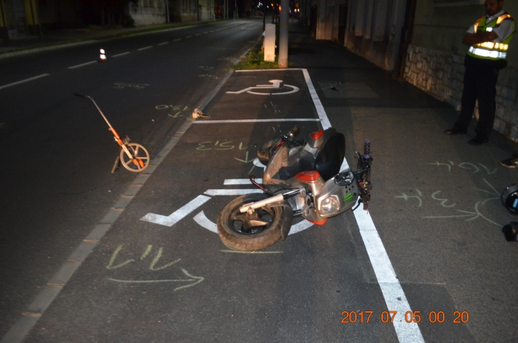 Egy 38 éves helyi férfi 23 óra 10 perckor Zalaegerszegen, a Rákóczi úton közlekedett motorkerékpárjával, amikor eddig tisztázatlan okok miatt áttért a menetiránya szerinti bal oldali útpadkára, ahol egy fának ütközött, majd elesett. A motoros a baleset következtében könnyebben sérült, a járműben anyagi kár keletkezett.