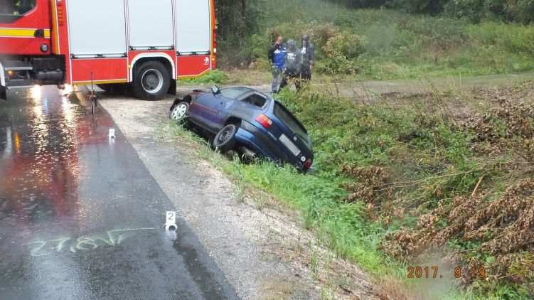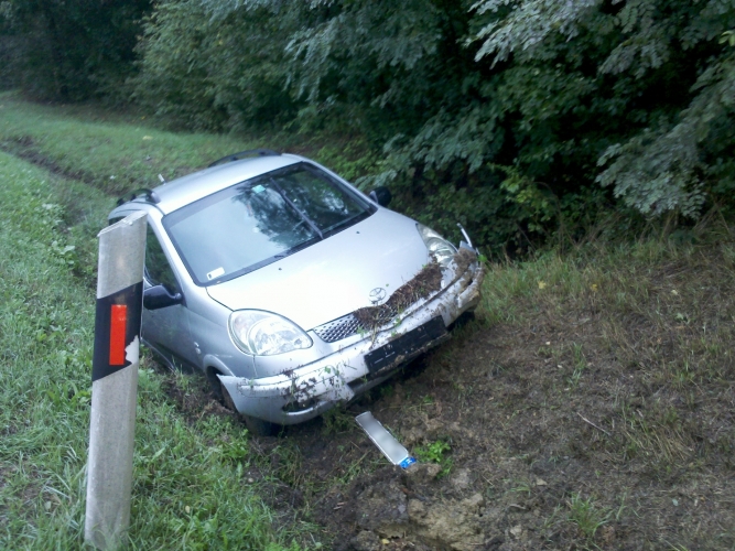 Egy 35 éves nő 14 óra 40 perckor Gellénháza irányából Zalaegerszeg felé közlekedett Toyota típusú személyautójával, amikor járműjével megcsúszott a vizes úttesten, majd az árok falának ütközve állt meg. A balesetben a gépkocsi vezetője nyolc napon belül gyógyuló könnyű sérülést szenvedett.