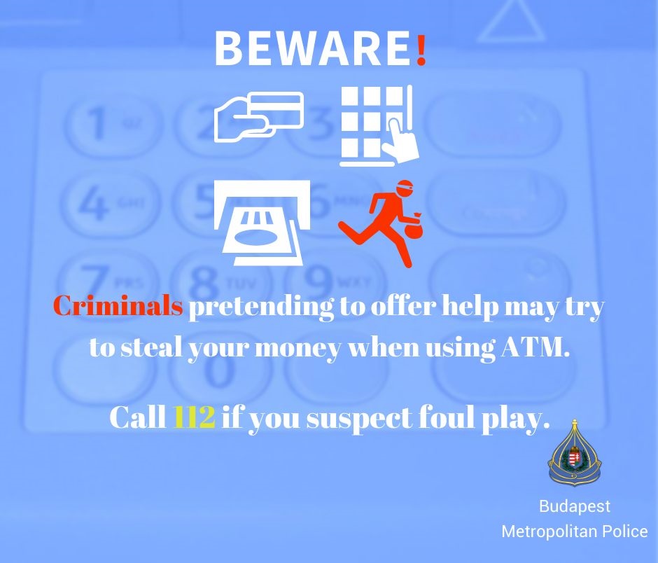 The Budapest Metropolitan Police call for awareness when withrawing cash from ATMs. Should you be targeted by this type of crime please call 112.