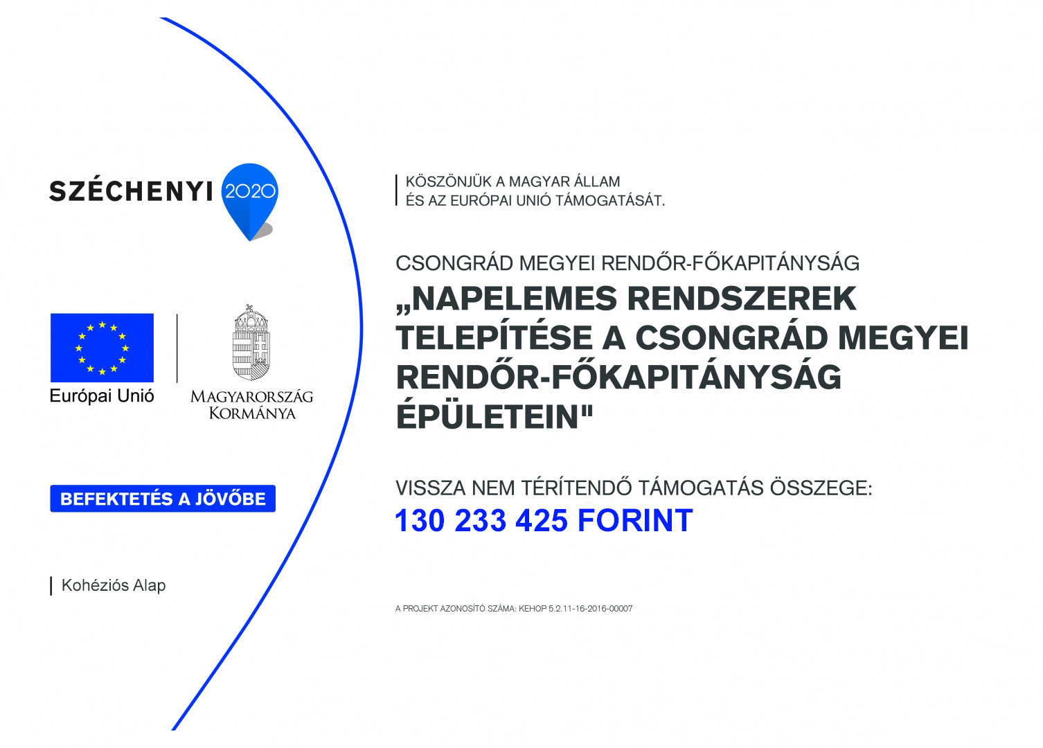 A Csongrád Megyei Rendőr-főkapitányság illetékességi területén, a Széchenyi 2020 alapján kiírt, KEHOP 5.2.11-16-2016-00007 pályázattal 5 rendőrségi objektum épületére telepítettek napelemes rendszereket.