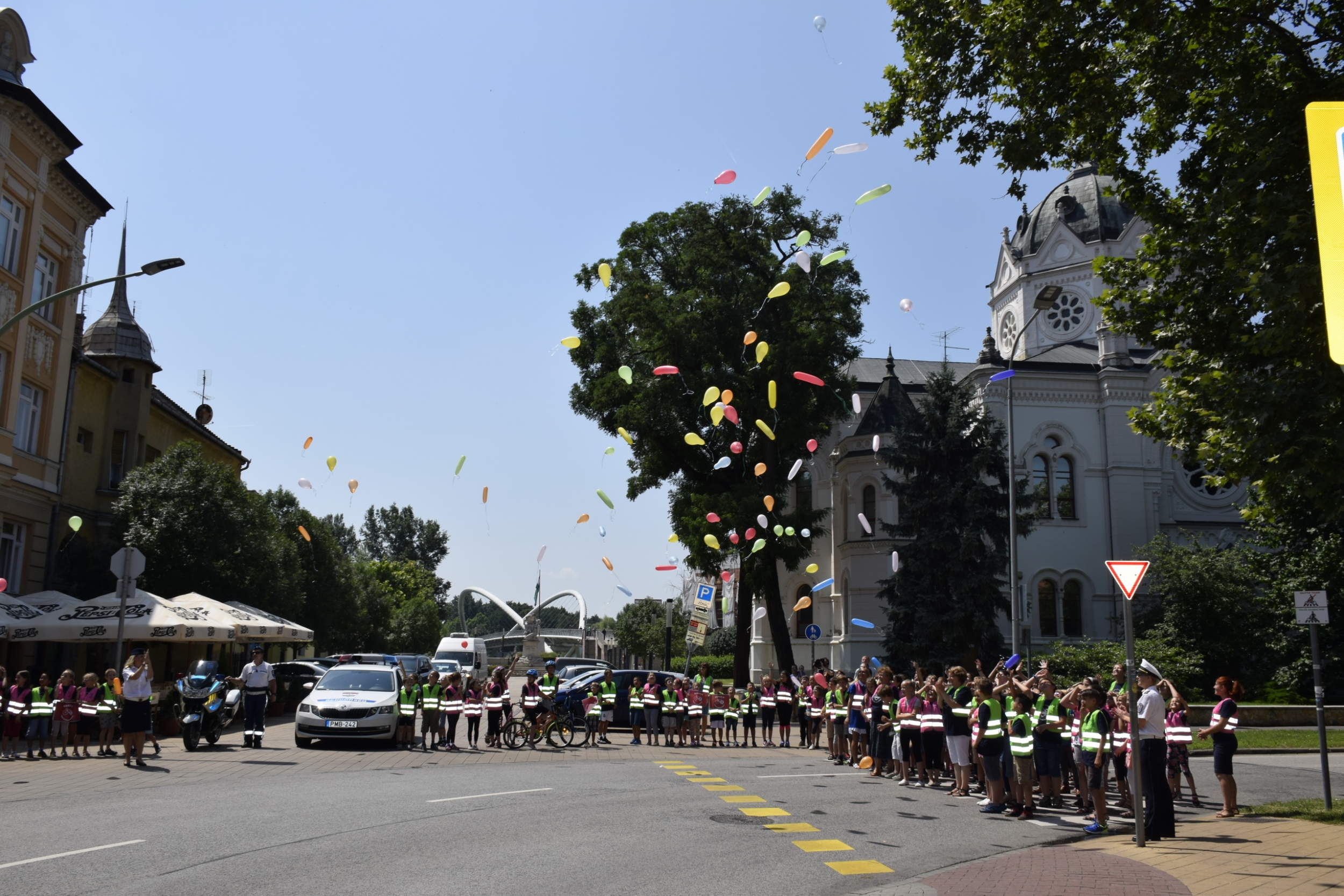 A gyerekek a rendőröktől láthatósági mellényt és egy-egy színes lufit kaptak, majd felsorakoztak a közeli kijelölt gyalogos-átkelőhelyeken, ahol a "vakáció alatt is biztonságban" szlogen elhangzása után egyszerre eresztették szélnek a lufikat.