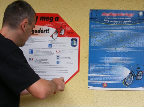 A megállásra kötelező „STOP” táblához hasonló alakú információs táblák kerülnek ki a napokban több Békés megyei kerékpárüzlet és szerviz ajtajára, falaira, valamint olyan helyekre, ahol nagy a kerékpáros forgalom. A Békés Megyei Baleset-megelőzési Bizottság 55 ilyen kültéri táblát készíttetett, ezen felül további 200 ugyanilyen tartalmú, papírra nyomtatott plakátot tesznek ki iskolákban, intézményekben. Ezzel kívánnak segíteni a kerékpárosoknak abban, hogy a rájuk vonatkozó szabályokat megismerjék és a saját biztonságuk érdekében alkalmazzák is.