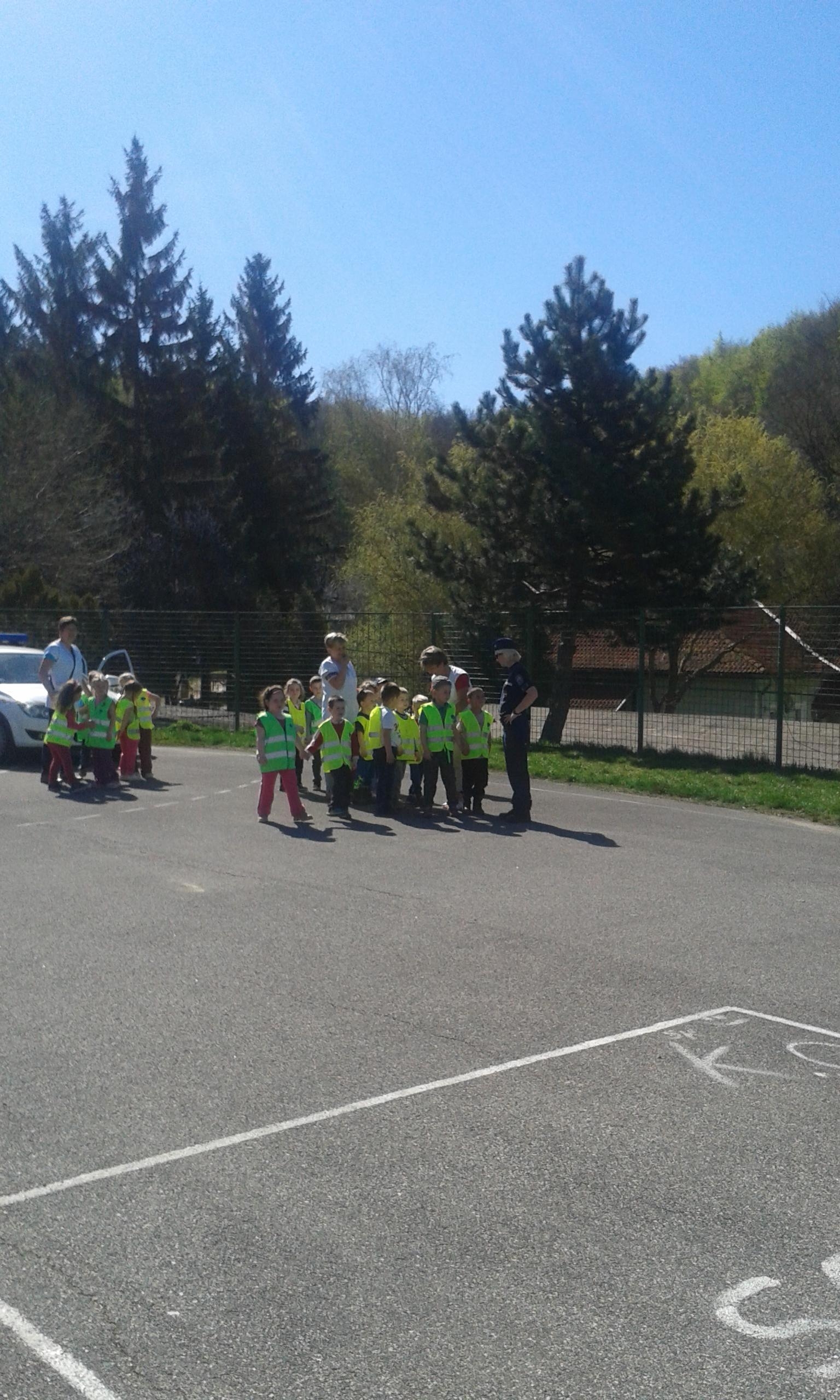 Gyuris Mónika rendőr főhadnagy láthatósági mellényben elkísérte a gyerekeket egy rövid sétára a forgalomban, eközben felhívta figyelmüket a biztonságos gyalogos közlekedés szabályaira.
