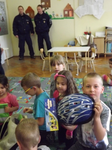 A körzeti megbízottak adták át az óvodásoknak a rendőrség ajándékait: kerékpáros fejvédő sisakokat, térd- és könyökvédőket, valamint láthatósági mellényeket.