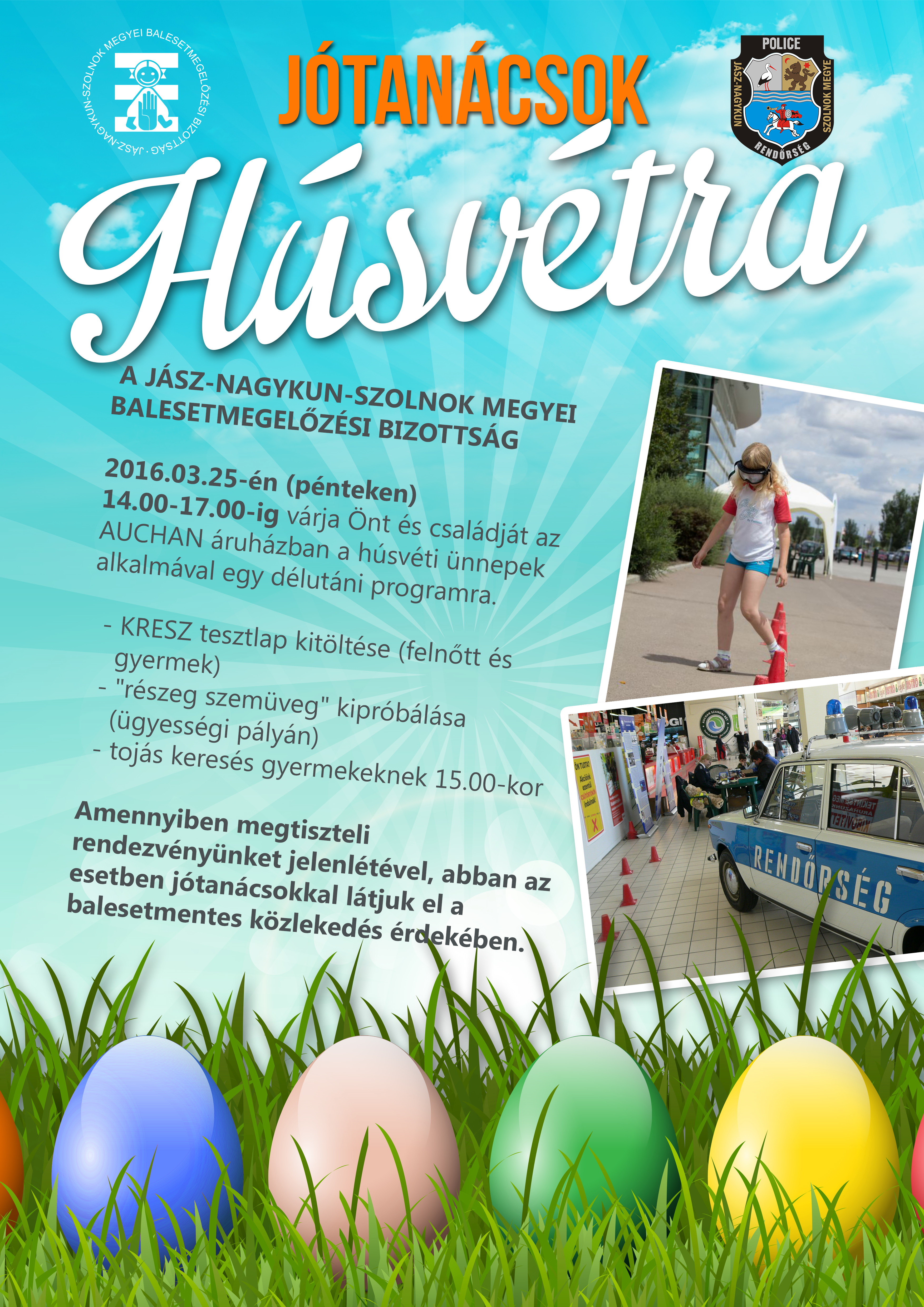 A balesetmentes ünnep érdekében a Jász-Nagykun-Szolnok Megyei Balesetmegelőzési Bizottság 2016. március 25-én 14 órától szeretettel várja az érdeklődőket, a családokat, a gyerekeket és a felnőtteket Szolnokon, az Auchan áruházban, ahol a tanácsok mellett érdekes, játékos feladatokkal is várják a látogatókat.