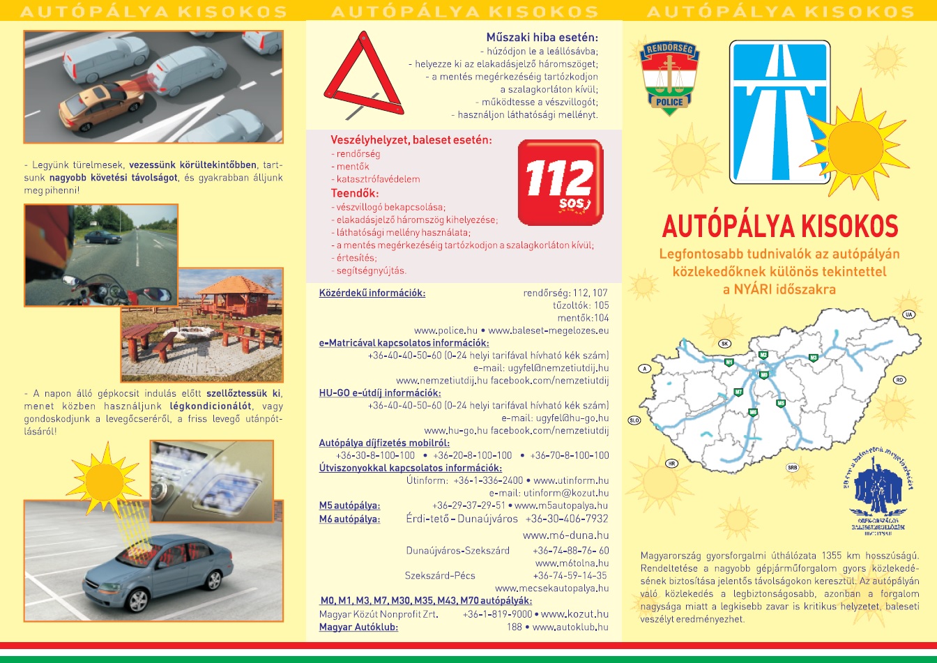 Honlapunkról letölthető az ORFK-Országos Balesetmegelőzési Bizottság által készített ismertető, mely az autópályákon közlekedők részére foglalja össze a legfontosabb tudnivalókat, különös tekintettel a nyári időszakra.