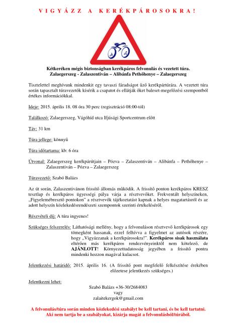 A Zalai Teker(g)ők Kerékpáros Sport és Túra Egyesület és a Zala Megyei Rendőr-főkapitányság Közlekedésrendészeti Osztálya egy tavaszi fáradságot elűző kerékpártúrára vár minden zalai és a megyébe látogató kerekezni vágyót 2015. április 18-án.