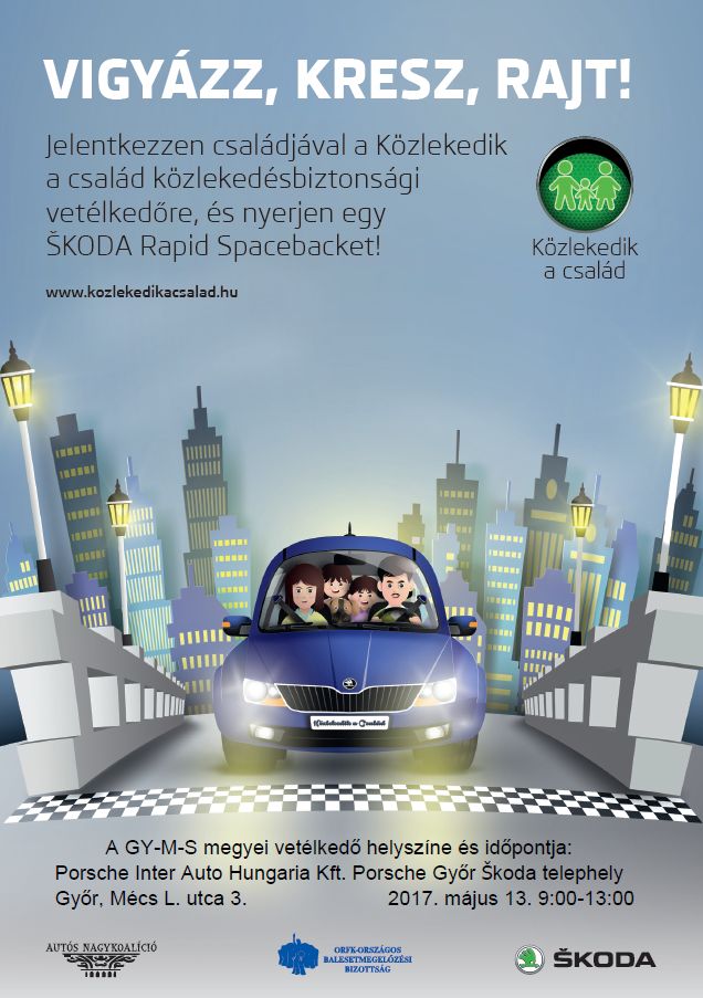 A „Közlekedik a család” elnevezésű programsorozatot az Országos Baleset-megelőzési Bizottság immár hatodik alkalommal szervezi meg. Győrött 2017. május 13-án 9 órától 13 óráig nyílik alkalmuk a versenyzőknek, hogy összemérjék tudásukat. A szervezők a győri Porsche Inter Auto Hungaria Kft. Győr, Mécs László utca 3. szám alatti telephelyén várják a vállalkozó szellemű családokat.