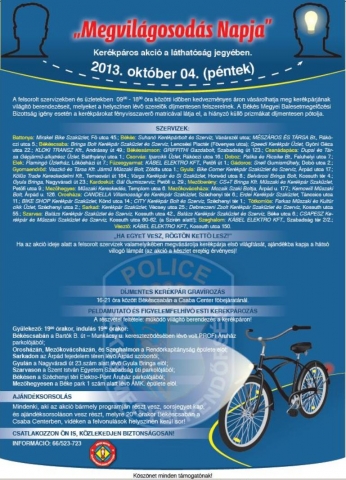 A Békés Megyei Baleset-megelőzési Bizottság rendezvényén, 2013. október 4-én kedvezményes vásárlási lehetőséggel várják a kerékpárosokat az akcióban résztvevő szervizek. Az esti órákban pedig figyelemfelhívó lámpafényes kerékpározás indul 9 városban.