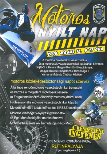 A Heves Megyei Baleset-megelőzési Bizottság a zökkenőmentes, biztonságos szezonkezdet elősegítése érdekében 2018. május 12-én a Heves Megyei Kormányhivatal Nagylapos úti rutinpályáján motoros nyílt napot szervez. A rendezvényen megjelenő motorosok részére vezetéstechnikai képzést nyújtanak a Heves Megyei Rendőr-főkapitányság motoros járőrei, akik segítenek felfrissíteni és elmélyíteni a motorosok KRESZ és elsősegélynyújtási ismereteit.