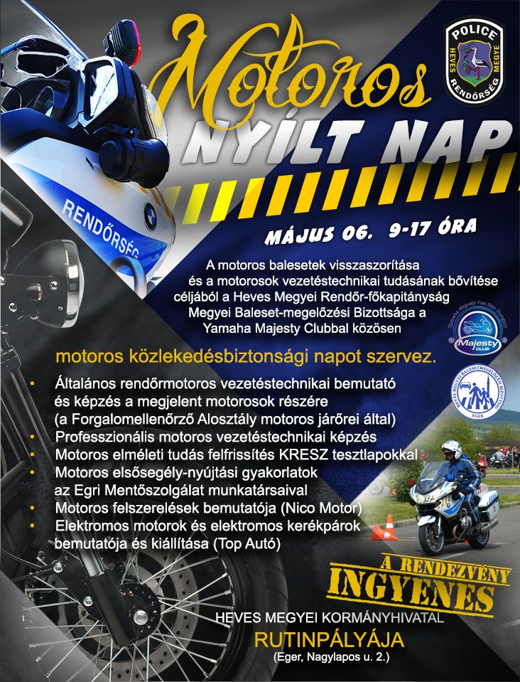 A motoros balesetek visszaszorítása és a motorosok vezetéstechnikai tudásának bővítése céljából a Heves Megyei Rendőr-főkapitányság - Megyei Baleset-megelőzési Bizottsága a Yamaha Majesty Clubbal közösen motoros közlekedésbiztonsági nyílt napot szervez 2017. május 6-án Egerben.
