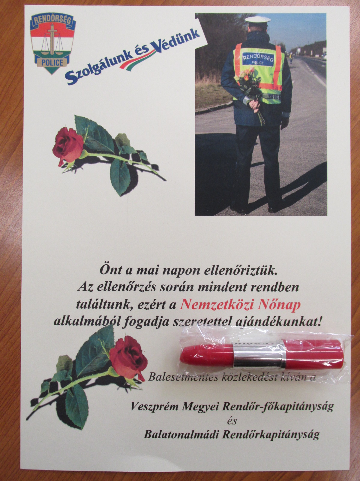 A Balatonalmádi Rendőrkapitányság 2016. március 8-án a déli órákra szervezett közlekedésbiztonsági fokozott ellenőrzést Balatonfűzfőn és Csajágon, ahol kiemelt figyelmet szenteltek a női vezetőknek. A rendőrök a szabályosan, érvényes iratokkal vezető hölgyeknek egy köszöntő oklevéllel és egy rúzst formáló tollal kedveskedtek. A baleset-megelőzési program keretében a járőrök ellenőrizték még a biztonsági öv és gyermekülés használatát.