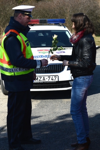 A Veszprémi Rendőrkapitányság Közlekedésrendészeti Osztályának munkatársai, Adamovics László rendőr százados, osztályvezető és Wittmann Krisztián rendőr zászlós, baleset helyszínelő, egy szál virággal és csokoládéval kedveskedtek a Nemzetközi Nőnap alkalmából a hölgy sofőröknek. Azok a járművezetők kaptak ajándékot, akiket 2015. március 8-án délelőtt Veszprémben a Pápai út bevezető szakaszánál ellenőriztek, és náluk mindent rendben találtak.