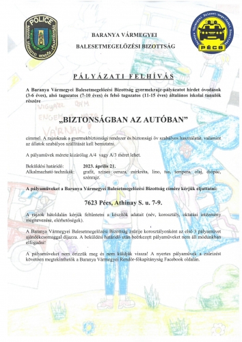 A Baranya Vármegyei Balesetmegelőzési Bizottság gyermekrajz-pályázatot hirdet óvodások (3-6 éves), alsó tagozatos (7-10 éves) és felső tagozatos (11-15 éves) általános iskolai tanulók részére