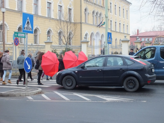 A „Piros Pajzs a Biztonságért” elnevezésű akció során, kijelölt gyalogos-átkelőhelyen áthaladó diákok 10 fős csoportja az érkező járműforgalom felé tartott piros esernyők kinyitásával és pörgetésével hívta fel a járművezetők figyelmét az elsőbbségi szabályok betartásának fontosságára.