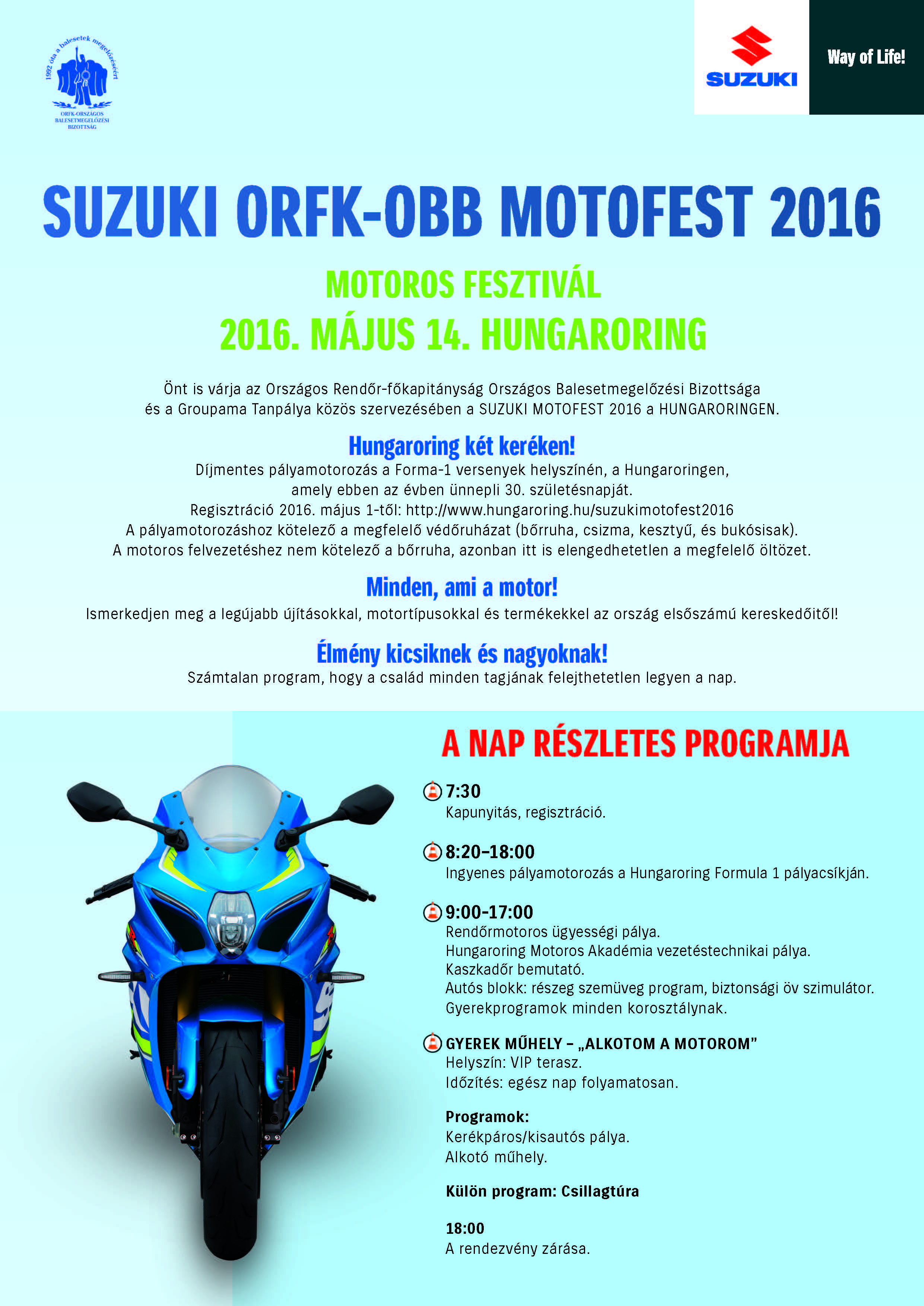 Az Országos Rendőr-főkapitányság Országos Baleset-megelőzési Bizottsága 2016. május 14-én a motoros balesetek megelőzése és a biztonságos közlekedés elősegítése érdekében egész napos rendezvénnyel várja az érdeklődőket a Hungaroringen.