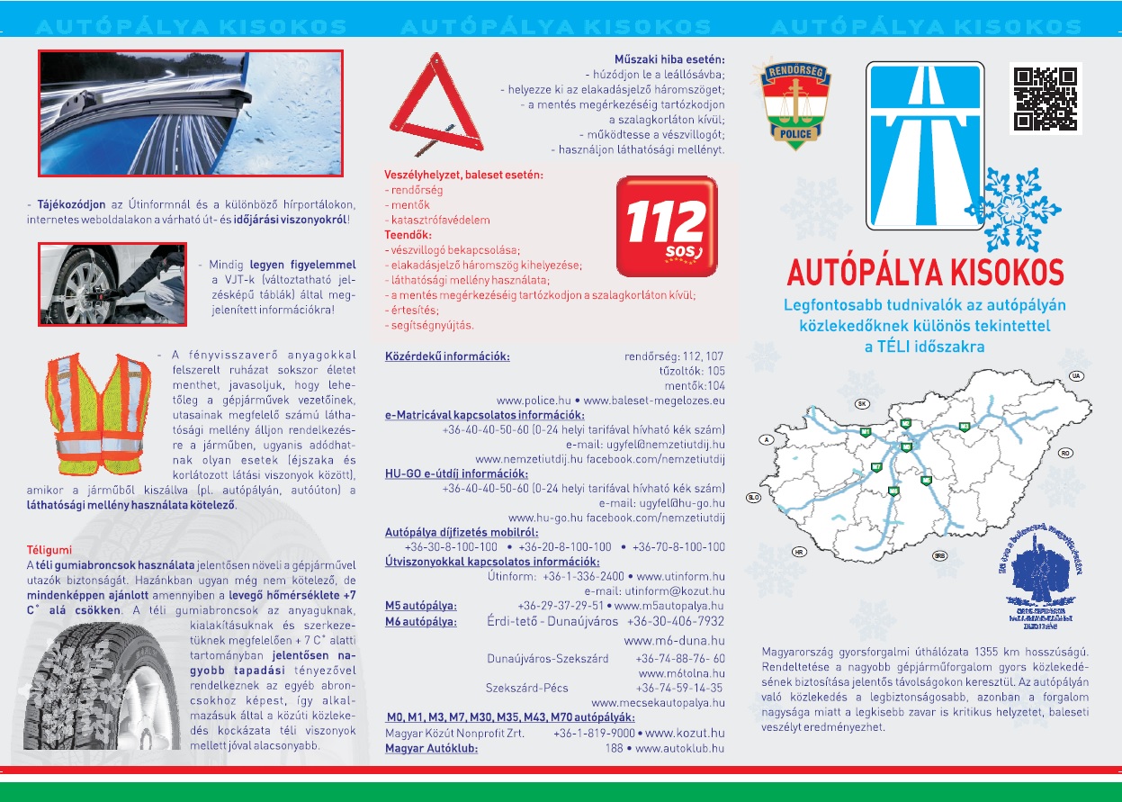 Hogyan közlekedjenek a gyorsforgalmi utakon a téli hónapokban? Melyek azok a legfőbb szabályok és hasznos tudnivalók, melyeket érdemes tudni és megtartani, amennyiben télen közlekednek? Ezekre a kérdésekre ad választ az ORFK-Országos Balesetmegelőzési Bizottság kiadványa, az „Autópálya kisokos”.