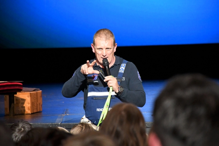 Két teltházas előadást tartott diákoknak a közlekedésbiztonságról Pintér József rendőr főtörzszászlós a Veszprémi Petőfi Színházban.