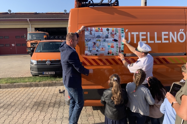 A rendőrségi rajzpályázat legjobb alkotásait helyezték el a gyerekek a rendőrök által szervezett ünnepségen a Magyar Közút járműveire.