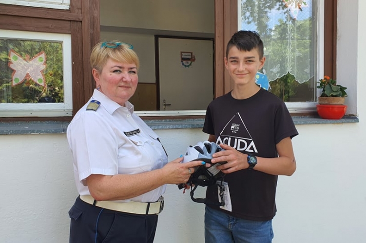 A Tolna Megyei Rendőr-főkapitányság baleset-megelőzési előadója egy sisakot adott át annak a 13 éves biciklisnek, aki a napokban szenvedett fejsérülést, mert egykerekezett a kerékpárjával, és elesett.